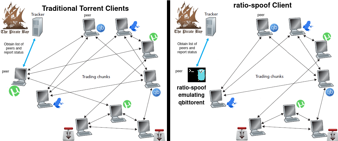 Ratio-spoof acts like a normal bittorrent client but without downloading or uploading anything, in fact it just tricks the tracker pretending that.