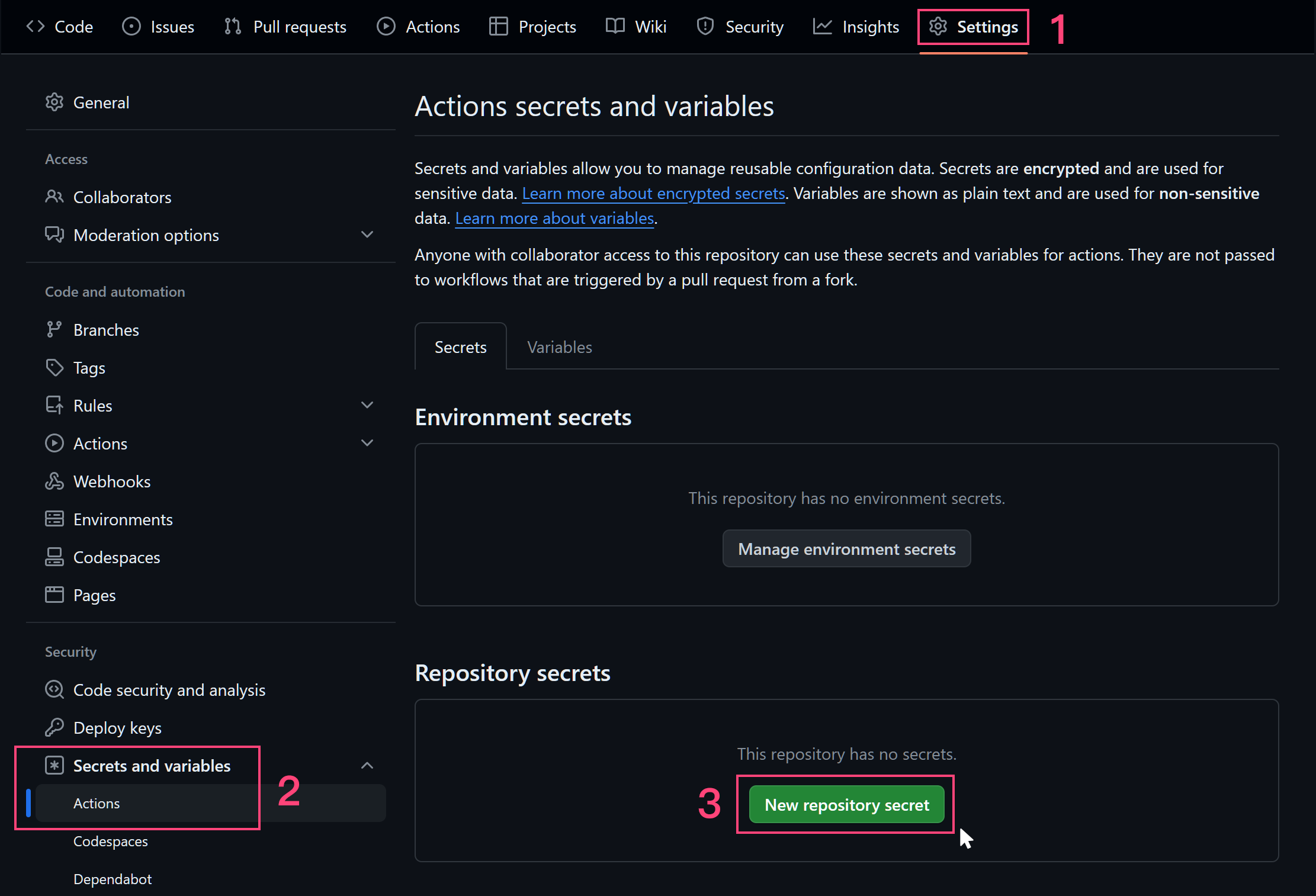After allowing the workflow, go to Settings > Secrets and variables > Actions > New repository secret to create a secret.