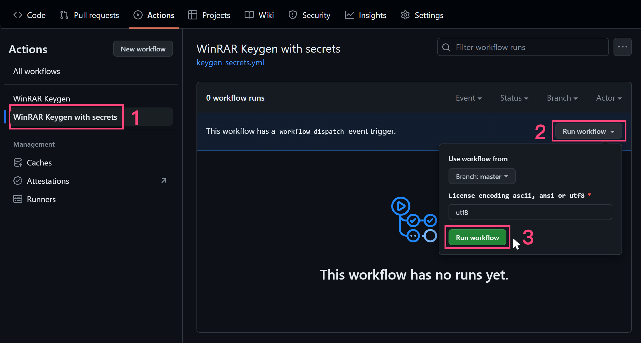 Go to Actions and select WinRAR Keygen with secrets to run workflow manually.