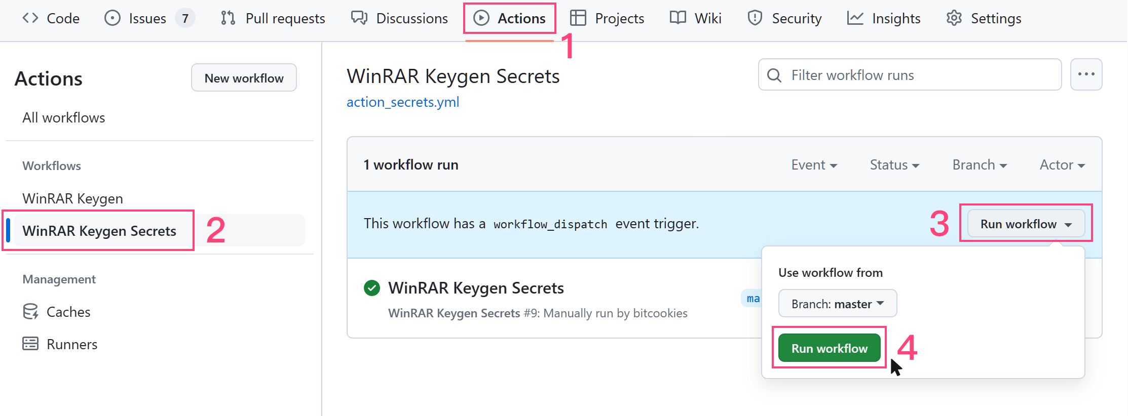 Go to Actions and select WinRAR Keygen Secrets to run Workflow manually.