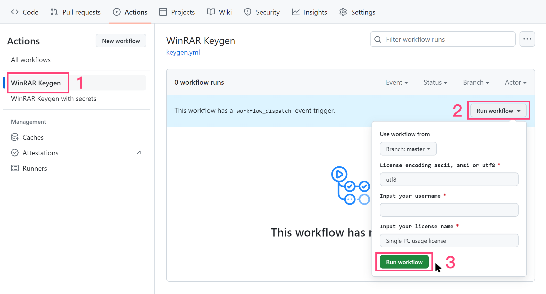 After allowing the workflow, go to Actions > WinRAR Keygen > Run workflow and fill in the information to start generating.