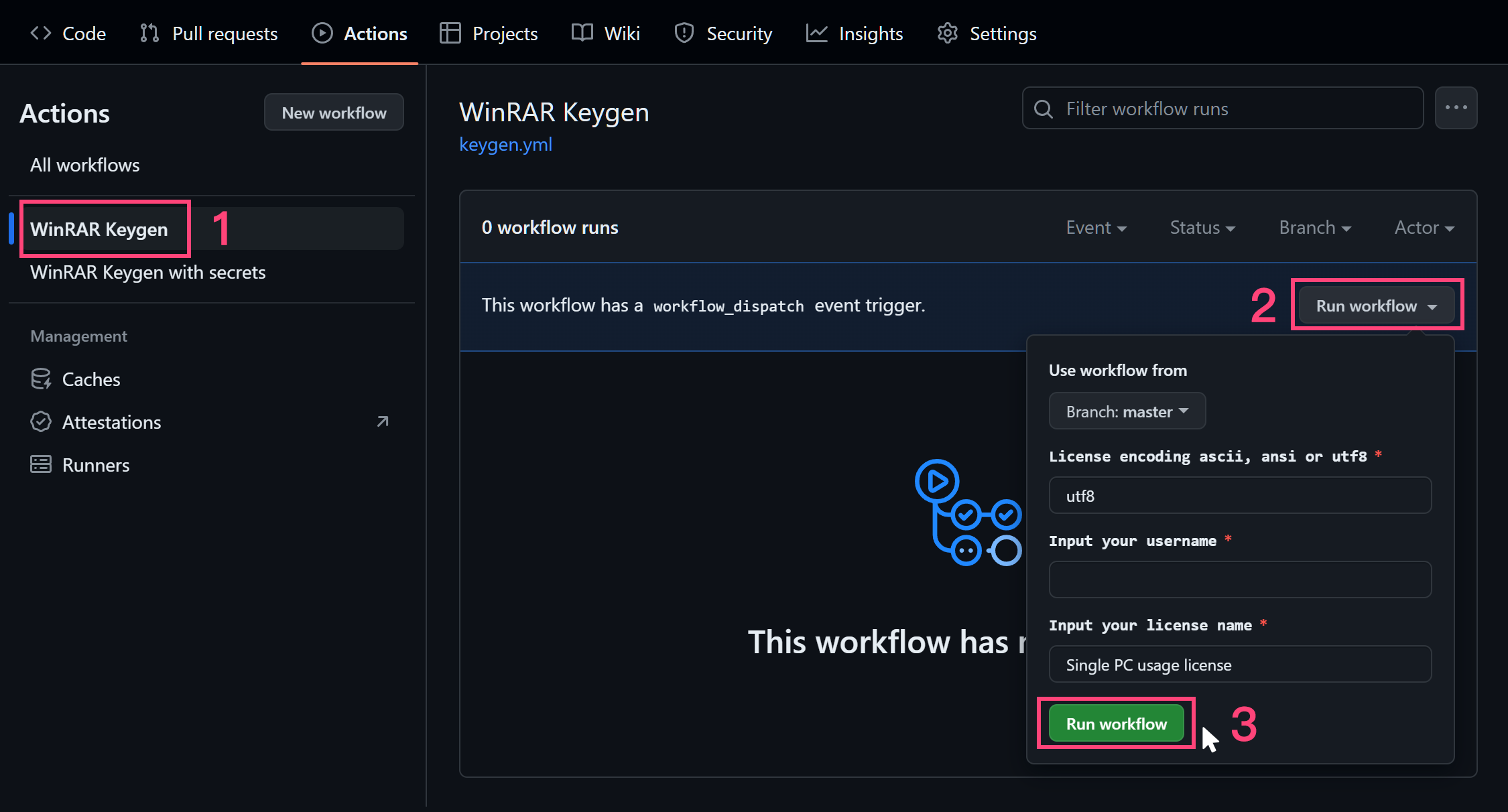 After allowing the workflow, go to Actions > WinRAR Keygen > Run workflow and fill in the information to start generating.