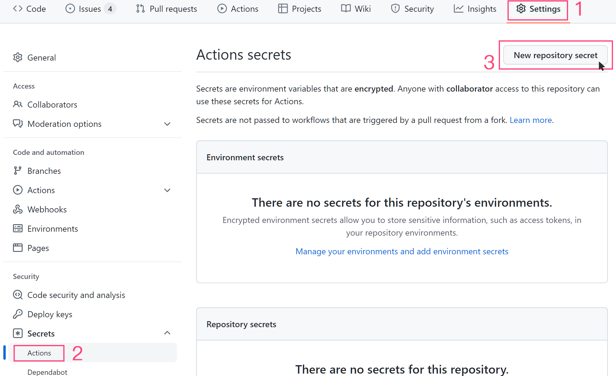 Open your forked repository, and go to Settings > Secrets > Actions > New repository secret.